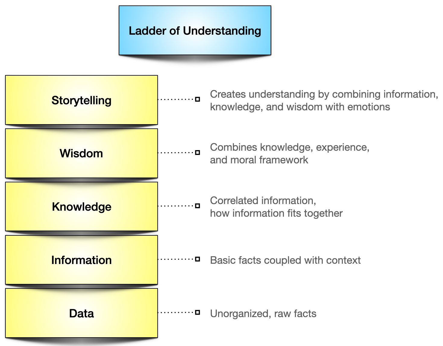 At the bottom of the ladder are unstructured elements, data, stand alone facts that lack meaning. Divulging only a set of facts doesn't make for a compelling story, although they do form the foundation for future storytelling. It's only when combined with context that facts become useful information. Context allows for categorization and leads to the next rung of the ladder: knowledge. This is a correlation step where a picture forms of how information fits together. There is an outline of a story that begins to take shape. This is when wisdom forms — combining knowledge, experience, and a moral framework of how the world ought to work. Now we have the elements needed for a storyteller. In this top step data, information, knowledge, and wisdom are portrayed in a narrative that elicits emotion.